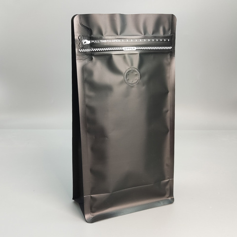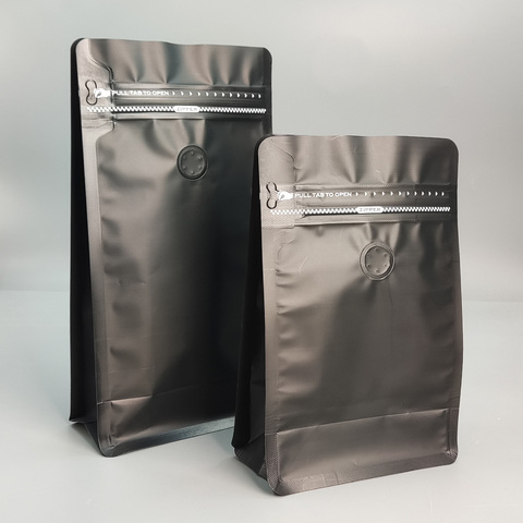 Bolsas de café de fondo plano negras de plástico personalizadas al por mayor, embalaje con válvula y cremallera
